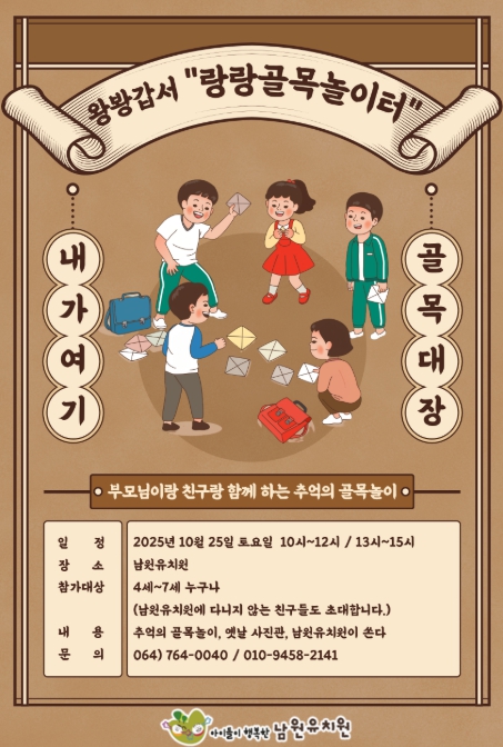 [메이저뉴스]제주도교육청 남원유치원은 25일 오전 10시와 오후 1시, 두 차례에 걸쳐 남원유치원에서 지역공동체 교육 프로그램인‘왕봥갑서 랑랑골목놀이터’를 운영한다.