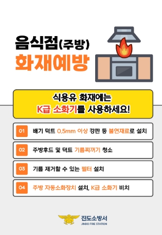 김재출 진도소방서장은 “주방 후드나 덕트에 기름때가 축적된 경우 작은 불씨도 대형 화재로 이어질 수 있다”며 “정기적인 청소와 함께 K급 소화기 비치 및 주방용 자동소화장치 설치 등 화재 예방 수칙을 철저히 지켜달라”고 말했다.