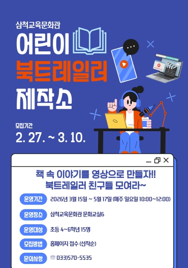 [메이저뉴스] 삼척교육문화관은 3월 15일부터 5월 17일까지 어린이들의 독서 흥미 증진과 창의력 향상을 위한 프로그램 ‘어린이 북트레일러 제작소’를 새롭게 운영한다.