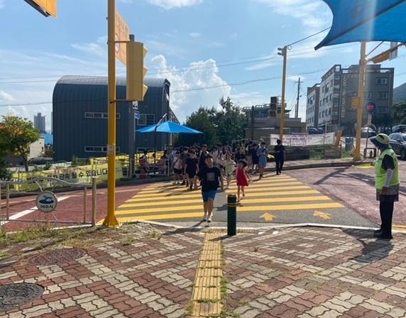 | ▲ 등하굣길 안전지킴이의 교통안내 지도에 따라 학생들이 안전하게 하교하고 있다. |
