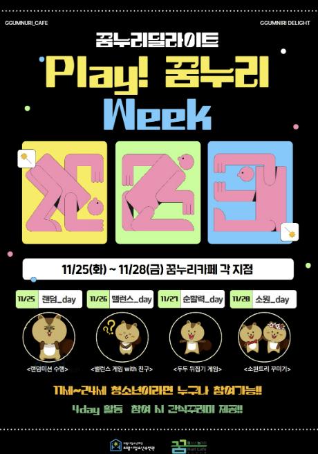 [메이저뉴스]의왕시청소년재단 산하 의왕시청소년수련관 꿈누리카페(▲고천점( 문화공원로 33), ▲내손점(복지로 109), ▲오전점(찬우물길 11), ▲백운밸리점(백운중앙로 74, 총 4개 지점))는 오는 11월 25일부터 28일까지 4일간 꿈누리딜라이트 『Play! 꿈누리 Week』를 진행한다고 밝혔다.