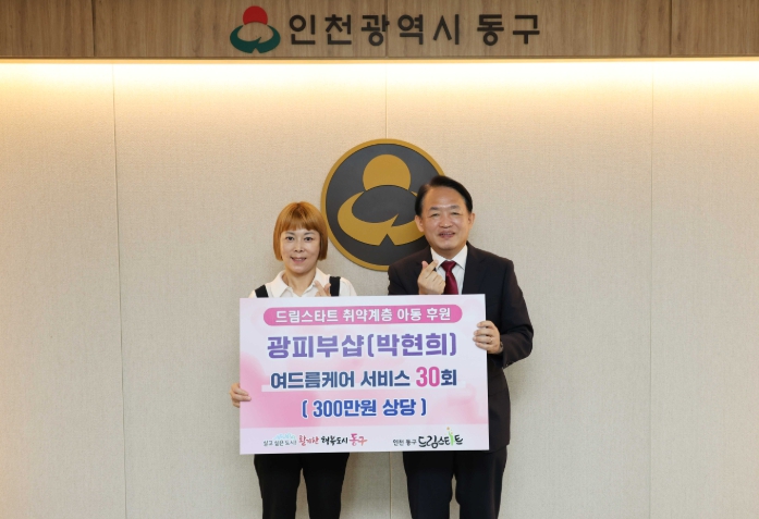 [메이저뉴스]인천 동구와‘광피부샵’(대표 박현희)은 지난 29일 구청 접견실에서 관내 드림스타트 아동을 위해 300만원 상당의 여드름 케어 서비스를 후원하는 기탁식 열었다고 밝혔다.
