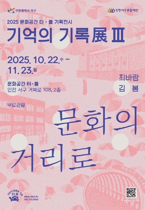 [메이저뉴스]인천서구문화재단은 10월 22일부터 11월 23일까지 문화공간 터·틀(석남)에서 기획전시 기억의 기록展 세 번째 시리즈 ‘문화의 거리로’를 개최한다.
