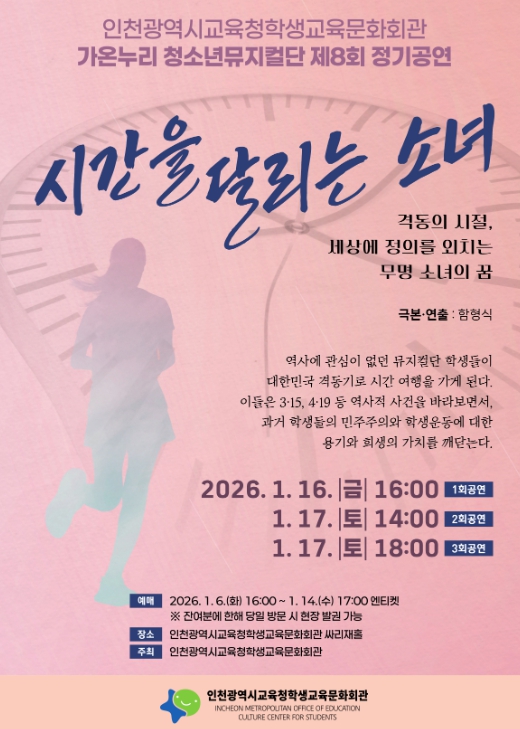 [메이저뉴스]인천광역시교육청학생교육문화회관은 가온누리 청소년뮤지컬단 제8회 정기공연 ‘시간을 달리는 소녀’를 16일부터 17일까지 싸리재홀 대공연장에서 개최한다.