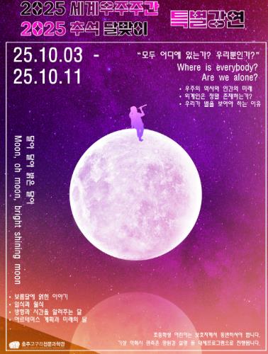 [메이저뉴스] 충주고구려천문과학관에서는 세계우주주간과 추석 한가위 연휴를 맞아 10월 3일부터 11일까지 특별 강연과 달맞이 관측 행사를 진행한다.