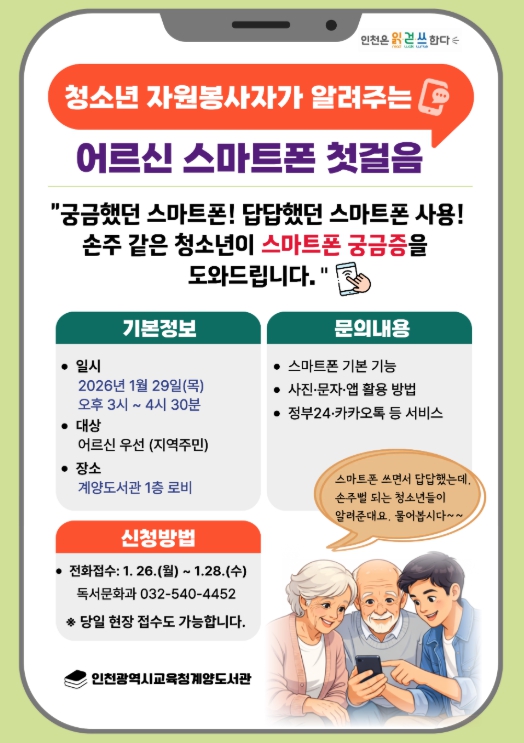 [메이저뉴스]인천광역시교육청계양도서관은 오는 29일 1층 로비에서 ‘어르신 스마트폰 첫걸음’행사를 운영한다.