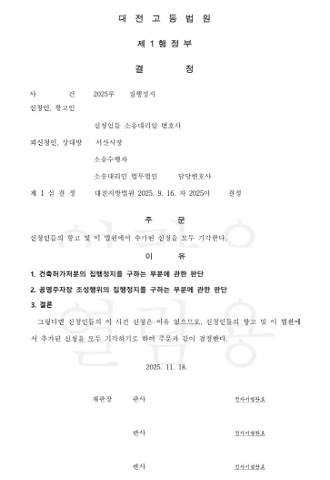 [메이저뉴스]충남 서산시가 추진하는 예천지구 공영주차장(초록광장) 조성사업과 관련하여 일부 시민이 제기한 건축허가처분 집행정지 항고에 대해 대전고등법원이 18일 기각 결정을 내렸다.