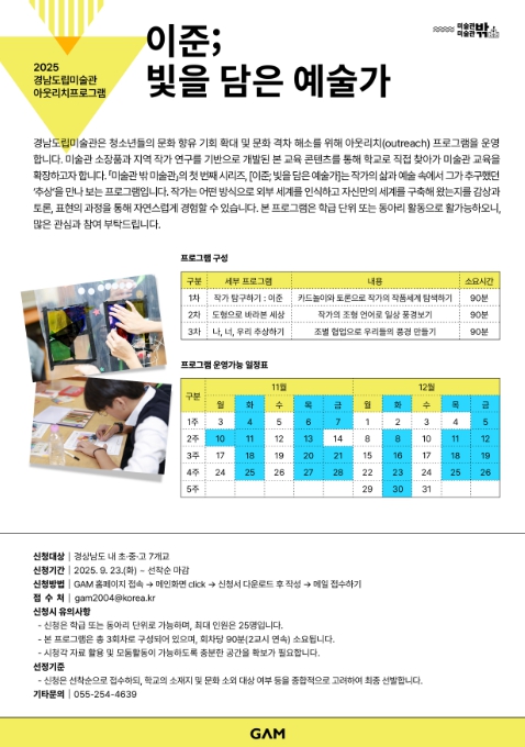 이번 프로그램은 경남을 대표하는 추상회화의 거장 '이준'의 삶과 작품세계를 중심으로 구성되며, 도내 초·중·고등학교 7곳을 대상으로 총 3회차에 걸쳐 진행된다.