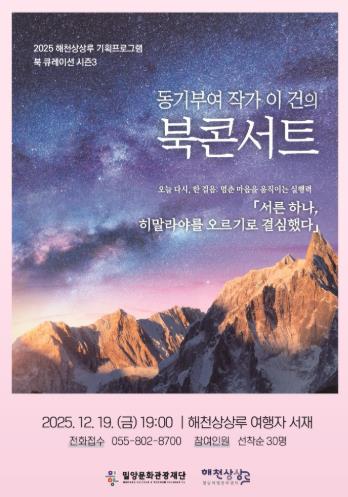[메이저뉴스]밀양문화관광재단은 오는 19일 오후 7시 해천상상루 여행자 서재에서 밀양여행문화센터 기획프로그램 ‘2025 북 큐레이션’ 네 번째 북 콘서트를 개최한다.