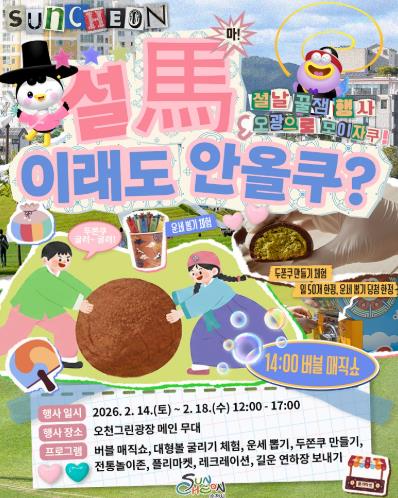 [메이저뉴스]순천시는 설 명절 기간 시민과 귀성객이 함께 즐길 수 있는 참여형 문화 프로그램 '설馬, 이래도 안올쿠?'를 오는 14일부터 18일까지 오천그린광장에서 운영한다.