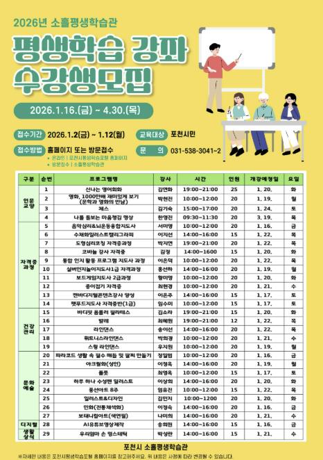[메이저뉴스]포천시는 오는 12일까지 소흘평생학습관에서 운영하는 2026년 1기 정규 평생학습 프로그램 수강생을 모집한다.