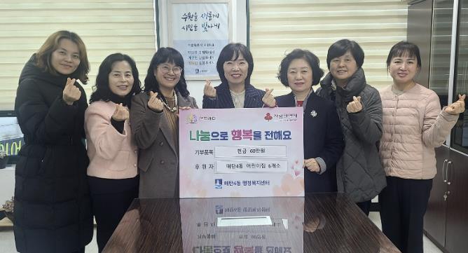 민상희 매탄4동장은 “어린이집 원장님들께서 보여주시는 꾸준한 이웃사랑이 우리 아이들에게 좋은 본보기가 되고 있다”며 “전달된 성금은 따뜻한 마음이 온전히 전해질 수 있도록 꼭 필요한 곳에 소중하게 사용하겠다”고 감사의 마음을 전했다.