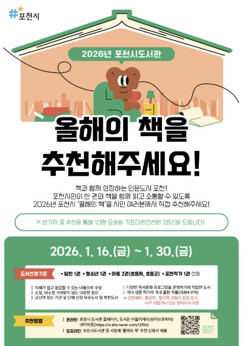 [메이저뉴스]포천시는 ‘2026년 포천시 올해의 책’ 선정을 위해 오는 16일부터 30일까지 시민 투표를 진행한다.
