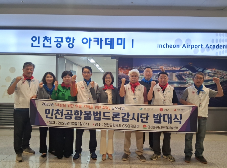 ‘인천공항불법드론감시단’은 센터가 인천국제공항공사와 구세군이 주관하는 ‘2025 건강한 인천공동체 만들기 공모사업’에 선정돼 사업비를 지원받아 운영하는 노인 일자리 사업으로, 중구 지역 어르신 5명으로 구성됐다.