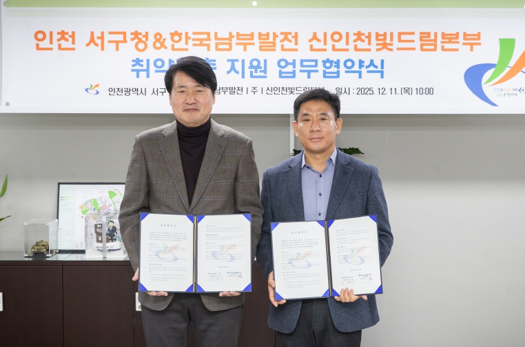 [메이저뉴스]인천 서구는 지난 11일 한국남부발전(주) 신인천빛드림본부(본부장 김경수)와 함께 취약계층 삶의 질 향상과 지역사회 복지 안전망 강화를 위한 업무협약(MOU)을 체결했다.