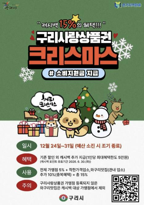 [메이저뉴스]구리시는 12월 24일부터 ‘구리사랑상품권 크리스마스 소비 지원금’을 지급한다고 밝혔다. 이번 소비 지원금은 연말연시 기간 지역 외로 유출되는 소비를 지역 내로 유도하고, 관내 상권 활성화와 소상공인 보호를 위해 마련됐으며, 예산 소진 시 조기 종료될 수 있다.