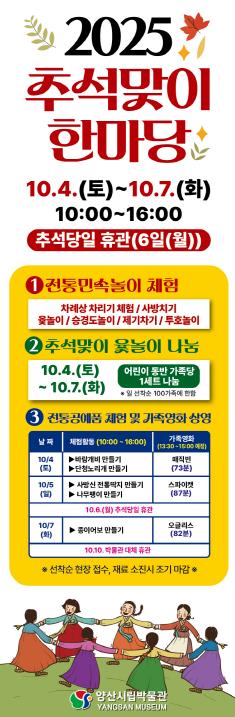 [메이저뉴스]양산시립박물관은 민족 최대의 추석 명절을 맞이하여 오는 10월 4일부터 7일까지 3일간 ‘2025년 추석맞이 놀이 한마당’을 운영한다고 밝혔다.