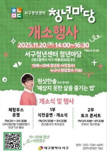 류한국 서구청장은 “‘서구청년센터 청년마당’이 청년이 자유롭게 모이고 교류하며 함께 성장할 수 있는 공간으로 자리 잡길 기대한다.”라며 “청년들의 새로운 시작을 서구가 응원하겠다.”라고 말했다.