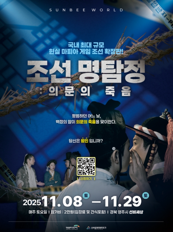[메이저뉴스]영주시 선비세상에서 오는 11월 8일부터 매주 토요일, 참가자가 직접 조선시대 인물이 되어 연쇄 살인 사건의 진실을 밝혀야 하는 국내 최대 규모 체험형 마피아 게임 ‘조선명탐정: 의문의 죽음’이 개최된다.