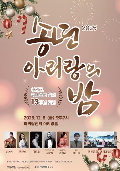 행사는 12월 5일 오후 7시부터 아리랑센터 아리랑홀에서 진행되며, 정선군립아리랑예술단을 비롯해 ‘트롯가수 서희철’, ‘팝피아니스트 임학성’, ‘드러머 안기승’, ‘베이시스트 류인기’, ‘소프라노 김희정’, 그리고 대한민국 대중음악계의 상징적 인물인 ‘송창식·정훈희, 기타리스트 함춘호’ 등이 무대에 오른다.