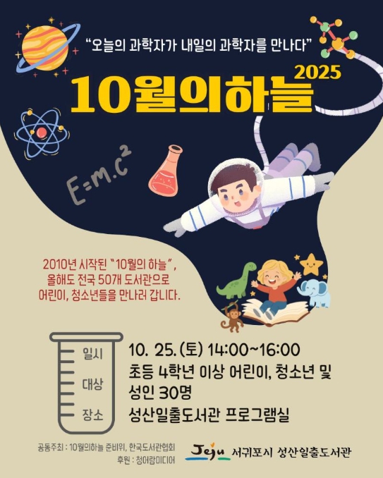 [메이저뉴스]서귀포시성산일출도서관은 오는 10월 25일 오후 2시부터 4시까지 과학자들의 재능기부로 진행되는 전국 과학 강연 행사 ‘10월의 하늘’을 운영한다.