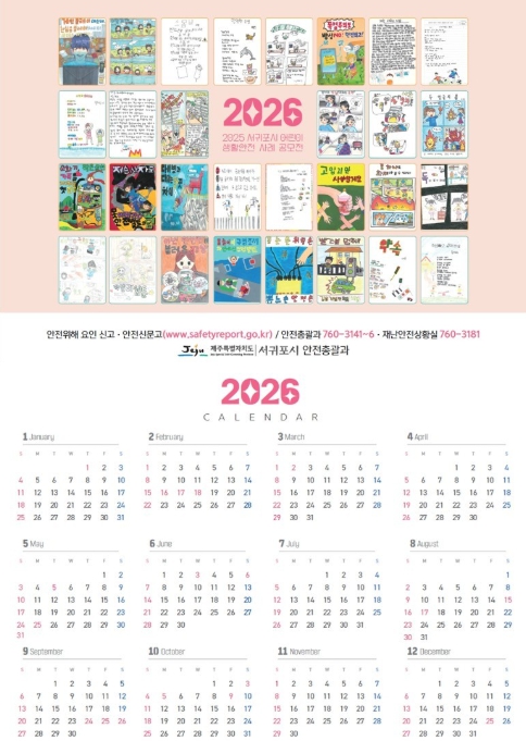 [메이저뉴스]서귀포시는 지역사회에 생활 속 안전의식 확산을 위해 2025 어린이 생활안전사례 공모전 수상작 30작품을 활용한 안전문화달력 1,500부를 제작하여 전 부서와 학교, 유관기관에 배부했다고 밝혔다.