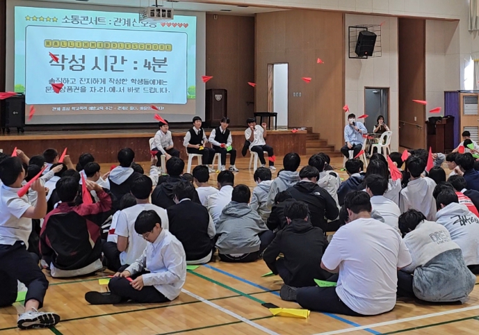 ‘소통 콘서트’는 전교생이 체육관에 모여 관계가 틀어진 경험과 관계 유지·증진을 위한 다짐을 색색의 종이에 적어 비행기로 날리며 서로의 감정을 공감하고 이해하는 시간을 가진 참여형 활동이었다.