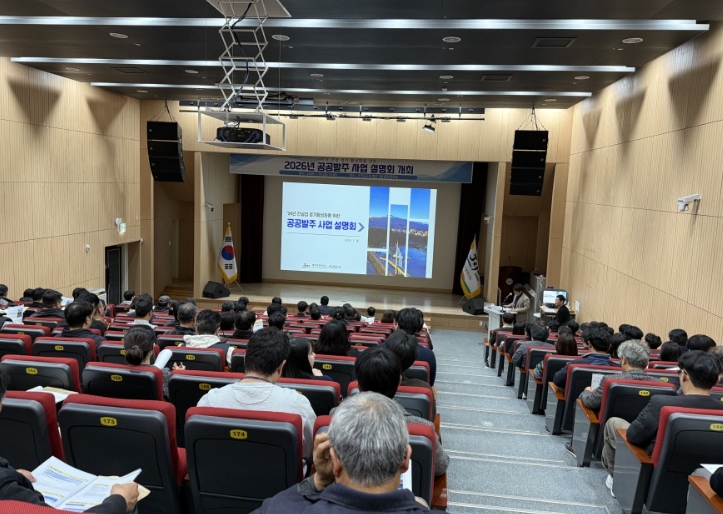 [메이저뉴스]서귀포시에서는 침체된 건설경기 활성화의 발판을 마련하고자 대한건설협회(전문포함) 회원 및 건설업 면허 등록업체 종사자 등 100여 명이 참석한 가운데 ‘'26년도 공공발주 사업 설명회’를 1월 16일 14시에 서귀포시청 별관 2층 문화강좌실에서 개최했다.
