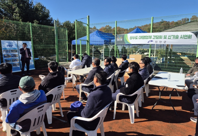 [메이저뉴스]진안군은 지난 11일 산약초 타운에서 관내 상하수도 대행업체 대표 및 실무자, 상하수도과 관계자 등 50여명이 참석한 가운데 ‘상하수도 대행업체 간담회 및 신기술 시연회’를 개최했다.