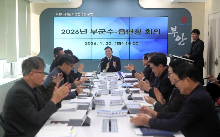 [메이저뉴스]부안군은 20일 군청 3층 중회의실에서 정화영 부군수 주재로 2026년 부군수-읍·면장 회의를 개최하고 2025년 주요 성과와 2026년 군정 운영방향을 공유하며 읍·면 현안에 대한 사전 점검에 나섰다고 밝혔다.