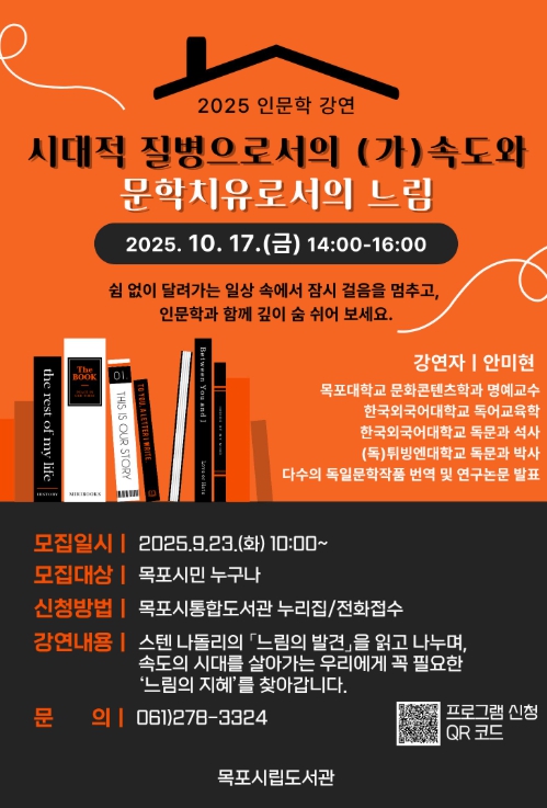 [메이저뉴스]목포시립도서관은 오는 10월 17일 오후 2시, 인문학 강연 ‘시대적 질병으로서의 (가)속도와 문학치유로서의 느림’을 진행한다.