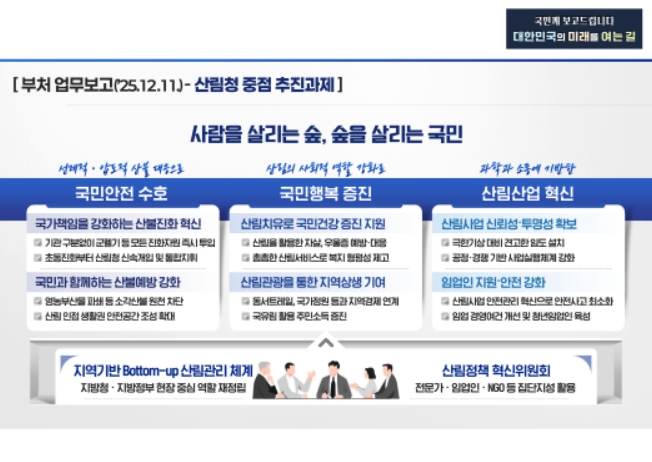 [메이저뉴스]산림청은 ‘정부 업무보고’를 계기로 ‘사람을 살리는 숲, 숲을 살리는 국민’ 실현을 위한 중점 추진과제를 11일 발표했다.