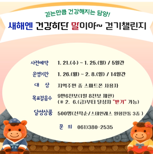 [메이저뉴스]담양군은 2026년 새해를 맞아 오는 1월 26일부터 2월 8일까지 온라인 걷기 챌린지 ‘새해엔 건강하단 말이야’를 운영한다고 밝혔다.