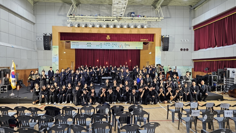 [메이저뉴스]세종특별자치시교육청은 11월 4일에 금호중학교 다목적강당에서 금호중학교(교장 강승연, 이하 금호중)의 ‘금호윈드오케스트라’(지도교사 조현영, 지휘자 연춘흠)와 연서중학교(교장 유효종)의 ‘연서오케스트라’(지도교사 이은정, 지휘자 김채연)가 함께 만드는 ‘2025 세종예술온(ON)학교’ 예술학교 ‘세종 학생 음악 나눔 축제’를 성황리에 마쳤다.