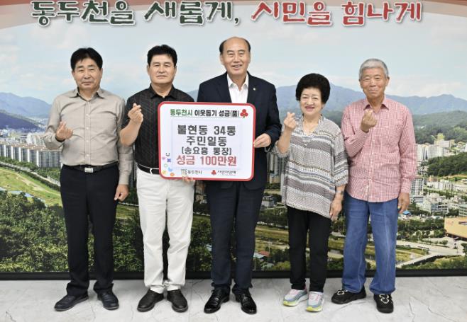 [메이저뉴스]동두천시 불현동 34통 주민일동은 9월 25일 동두천시청을 방문해 지역 내 저소득 가정을 돕기 위한 성금 100만 원을 기탁했다.