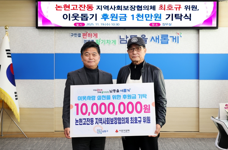 [메이저뉴스]인천시 남동구는 논현고잔동 지역사회보장협의체 최호규 위원으로부터 이웃돕기 성금 1천만 원을 기탁받았다고 24일 전했다.