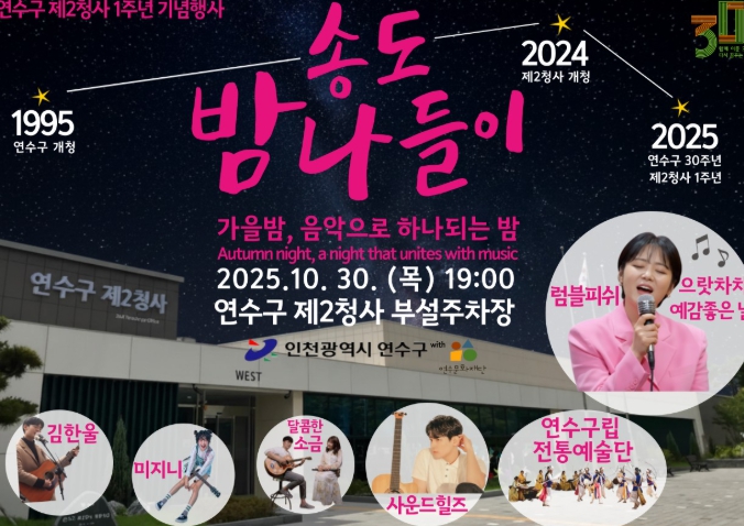[메이저뉴스]연수구는 오는 30일 19시 연수구 제2청사 부설주차장 특설무대에서 제2청사 개청 1주년을 지역 주민과 함께 축하하기 위해 기념행사 ‘송도 밤 나들이’를 개최한다.