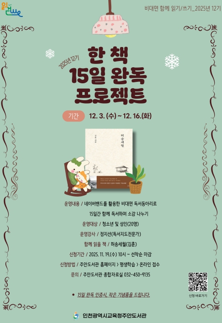 [메이저뉴스]인천광역시교육청주안도서관은 11월 19일 오전 10시부터 ‘12기 비대면 함께 읽기-한 책 15일 완독 프로젝트’ 참여자를 모집한다.