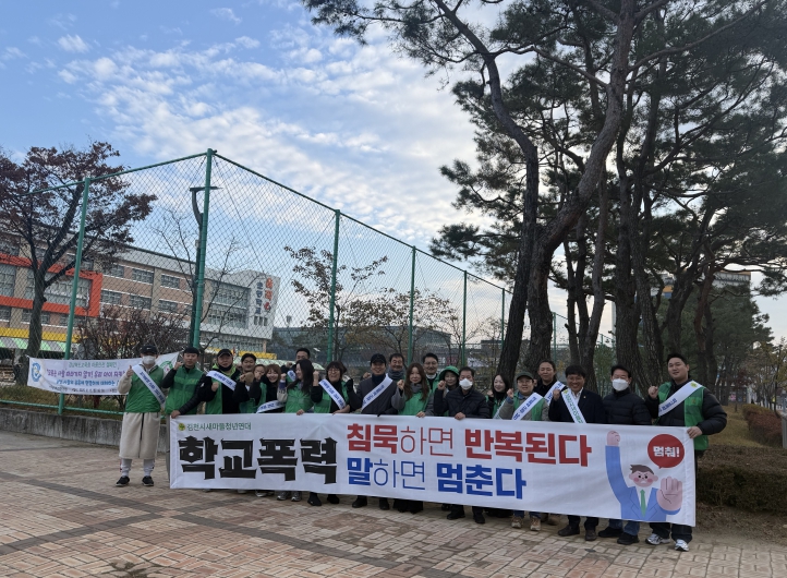 이번 행사는 학교폭력 근절을 통한 아이들의 안전한 교육환경 조성을 취지로 김천시청년새마을연대와 김천경찰서가 합동으로 진행한 캠페인으로, 쌀쌀한 날씨에도 불구하고 청년새마을연대 회원과 경찰관 등 30여 명이 참석하여 캠페인 활동에 열심히 임했다.