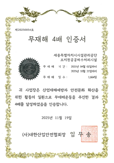 | ▲ 조치원하수 무재해 4배수 인증서 |