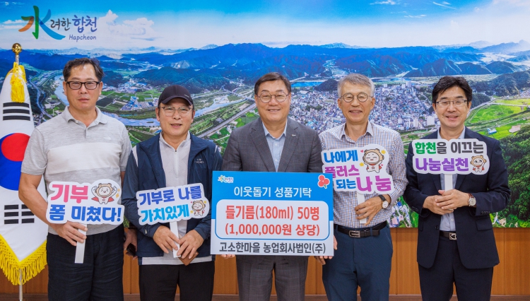 [메이저뉴스]고소한마을 농업회사법인(대표 하성목)은 9월 22일 합천군청을 방문해 이웃돕기 성품으로 100만원 상당의 들기름 50병을 합천군에 기탁했다.