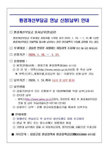 [메이저뉴스]함양군은 경유를 연료로 사용하는 자동차(2012년 3월 이전 제작·등록에 한함)에 매년 3월과 9월 부과되는 환경개선부담금의 일시 납부(연납)를 1월 31일까지 접수 받고 있다.