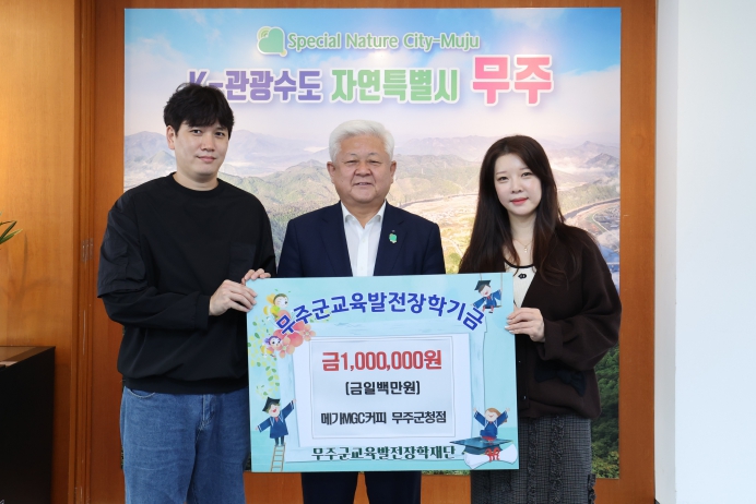 [메이저뉴스]메가MGC커피 무주군청점에서 지난 23일 (재)무주군교육발전장학재단(이사장 황인홍 무주군수)에 장학금 1백만 원을 기탁했다.