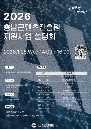 [메이저뉴스](재)충남콘텐츠진흥원(원장 김곡미)은 오는 1월 28일 오후 2시, 충남콘텐츠기업지원센터 이벤트홀에서 ‘2026년 지원사업 설명회’를 개최한다고 밝혔다.