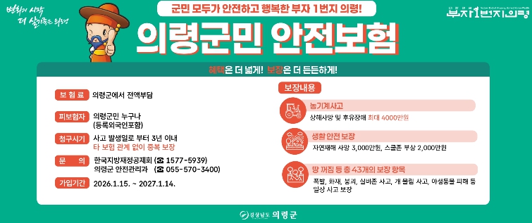 [메이저뉴스]의령군은 일상생활 중 예기치 못한 재난과 사고로부터 군민의 생활 안정을 지원하기 위해 ‘2026년 군민안전보험’에 갱신 가입하고, 1월 15일부터 본격 운영에 들어간다고 밝혔다.