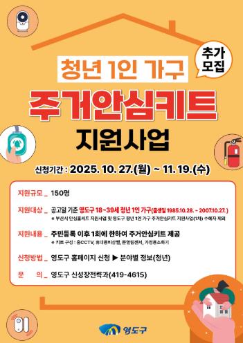 [메이저뉴스]부산 영도구는 지역 내 청년 1인 가구의 주거 안심도를 높이고 사회적 고립감을 해소하는 등 안전한 주거환경을 조성하고자 ‘청년 1인 가구 주거안심키트 지원사업’을 1차에 이어 2차로 추가 모집에 나선다.