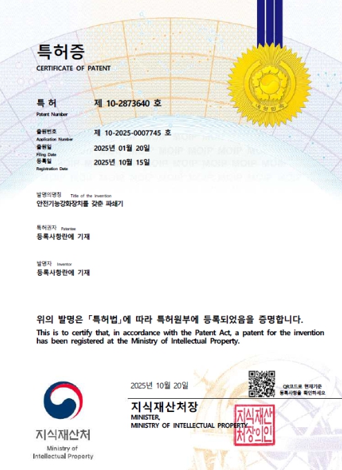 [메이저뉴스]제주특별자치도 농업기술원은 ㈜한성티앤아이와 공동으로 개발한 무선인식(RFID) 기반 안전기능 강화 장치를 갖춘 파쇄기 기술이 기술개발 특허로 등록됐다고 밝혔다.
