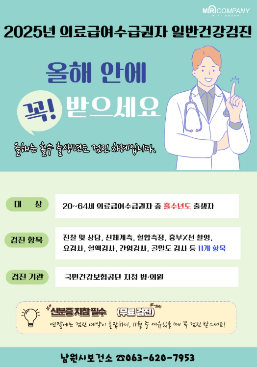[메이저뉴스]남원시보건소는 의료 취약계층의 질병 예방 및 조기 발견을 위한 의료급여수급권자 대상 무료 일반건강검진을 적극 독려하고 있다.