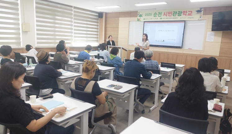 | ▲ 순천 시민관광학교에 참여한 시민들이 치유분야 강좌를 듣고 있다. |