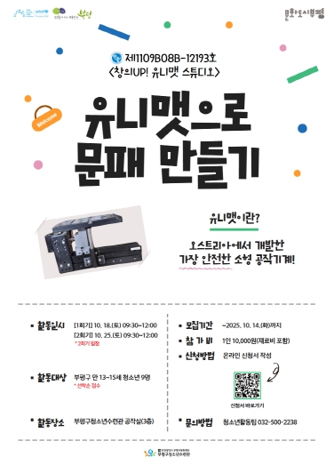 [메이저뉴스]부평구 청소년수련관은 오는 14일까지 부평 내 14~16세 청소년을 대상으로 ‘창의 UP! 유니맷 스튜디오!’ 참가자를 모집한다.